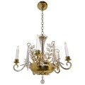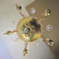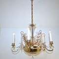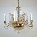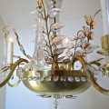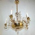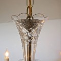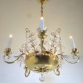 Dish form chandelier in the style of Maison Bagues. Lighting includes five-arm candles and interior lights that illuminate the pierced brass dish. Center column is surrounded by crystal leaves with hanging crystal fluted vase shaped strands. Uses five total 40-watt candelabra size bulbs for the arms and 3 – 15 watt max bulbs for the interior lights. Interior lights can be turned off by the crystal pull chain. Newly wired. Overall height including chain and citing canopy 37″ and be adjusted to suit. Diameter 20″.