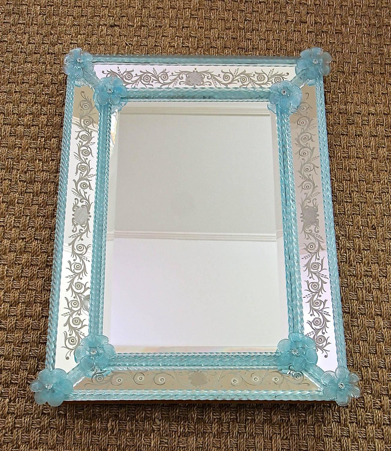 Murano Venetian Blue Floral Etched Wall Mirror